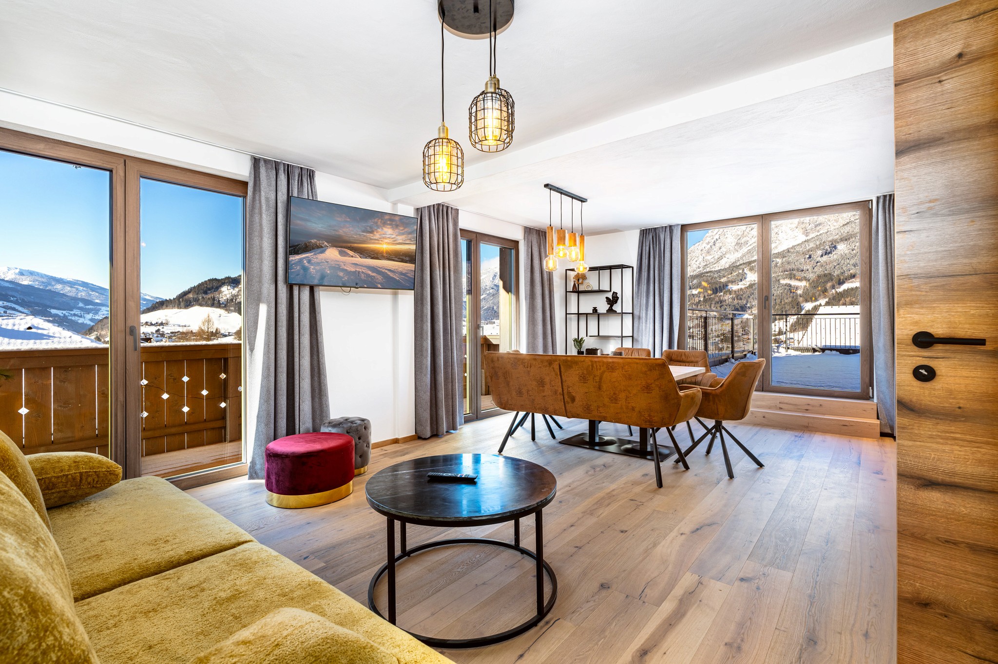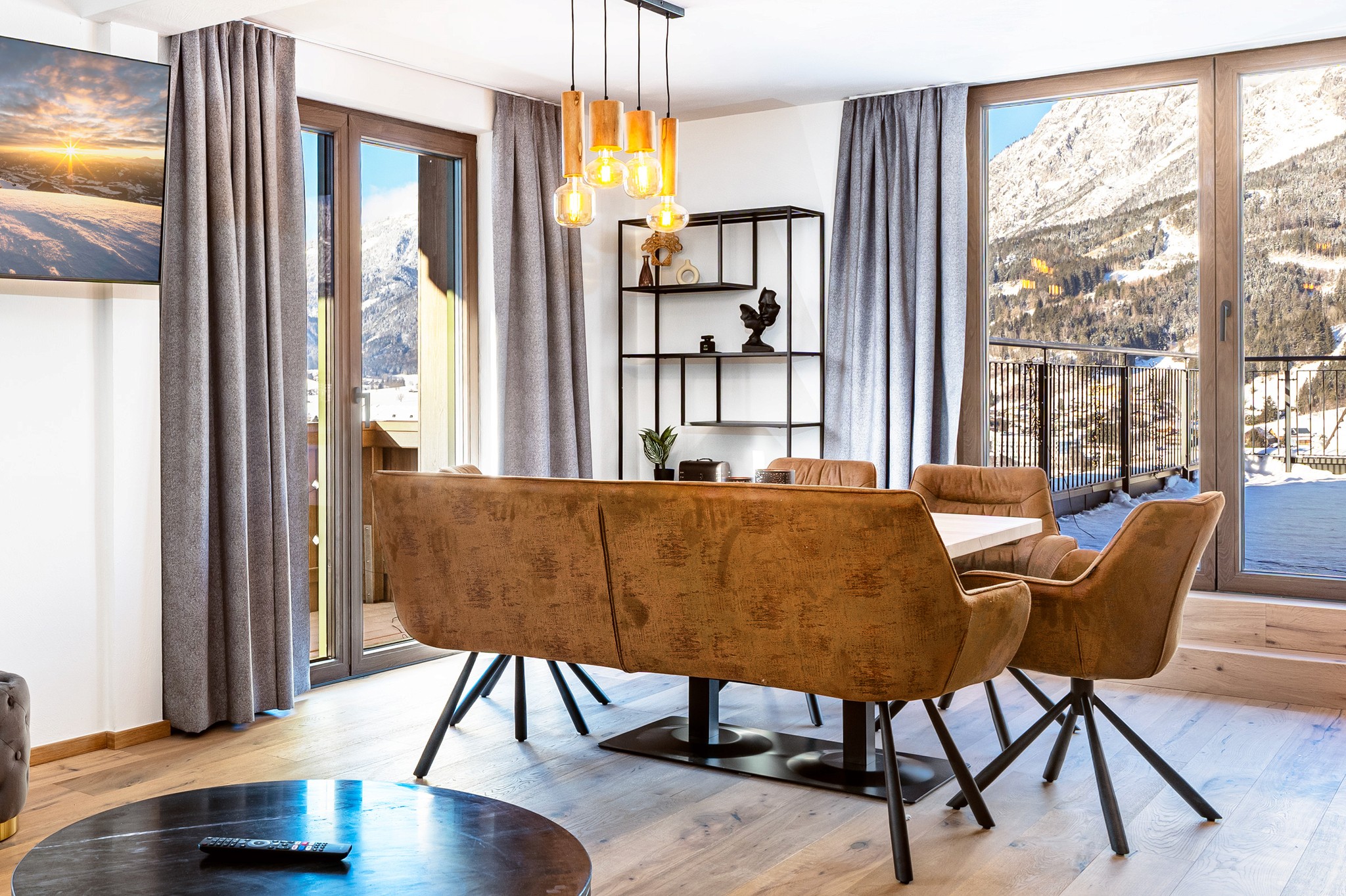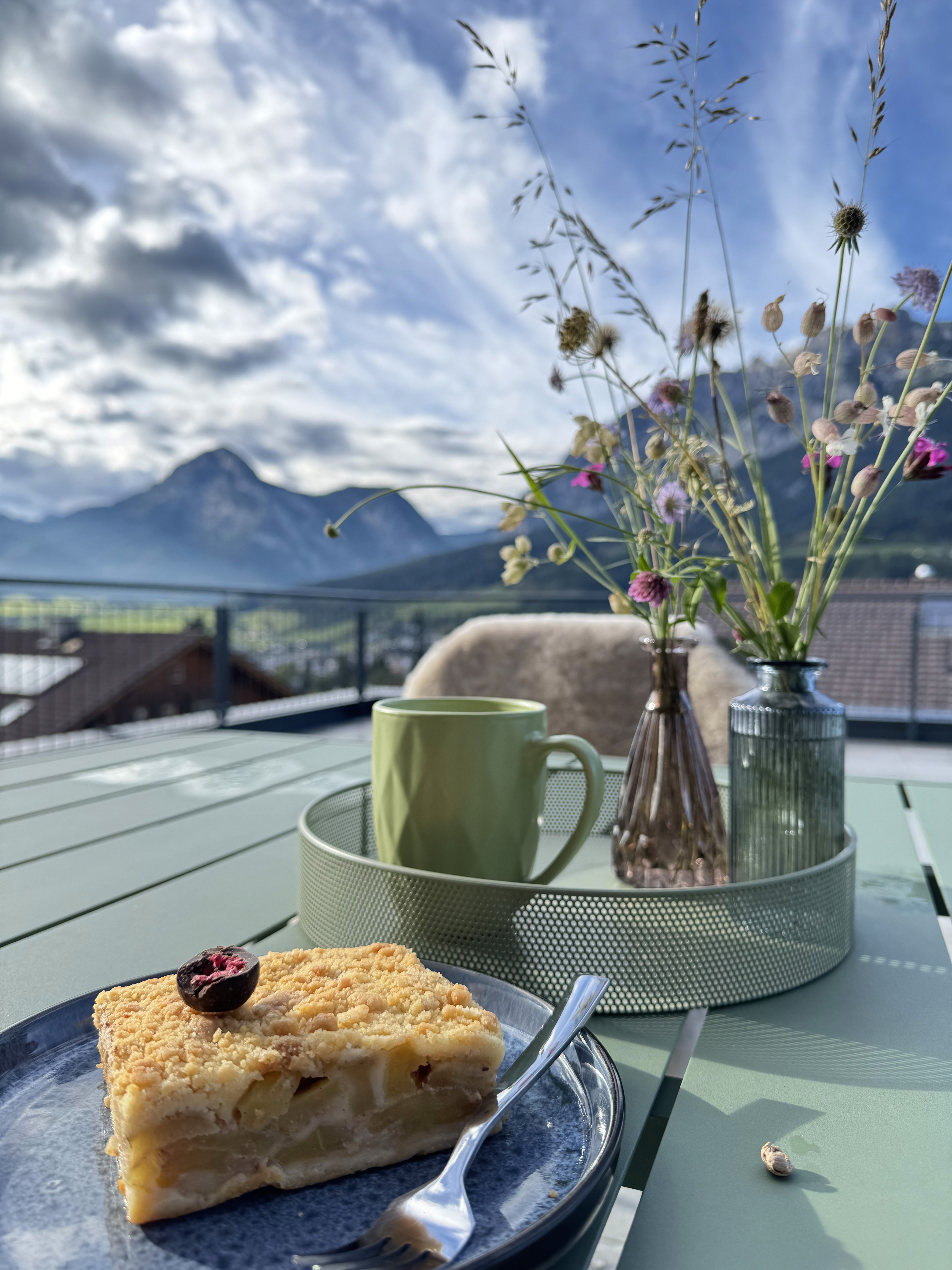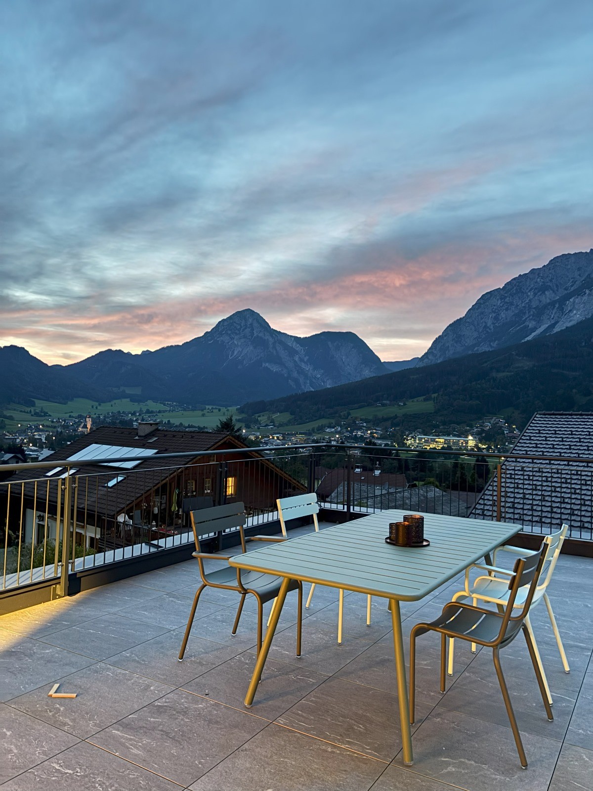 Entspanne oder genieße dein Essen auf der großen Terrasse – mit Blick auf die beeindruckende Alpenkulisse.